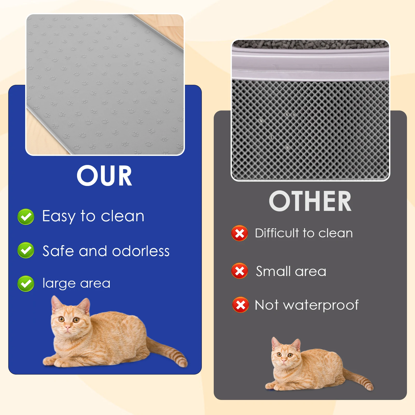 Silicone Cat Litter Mat: Crafted from silicone, the cat litter mat is safe; nonslip and enduring. It adheres well to the floor, prevents sliding, and can withstand daily use and cat claw scratches, making it ideal for cat activities