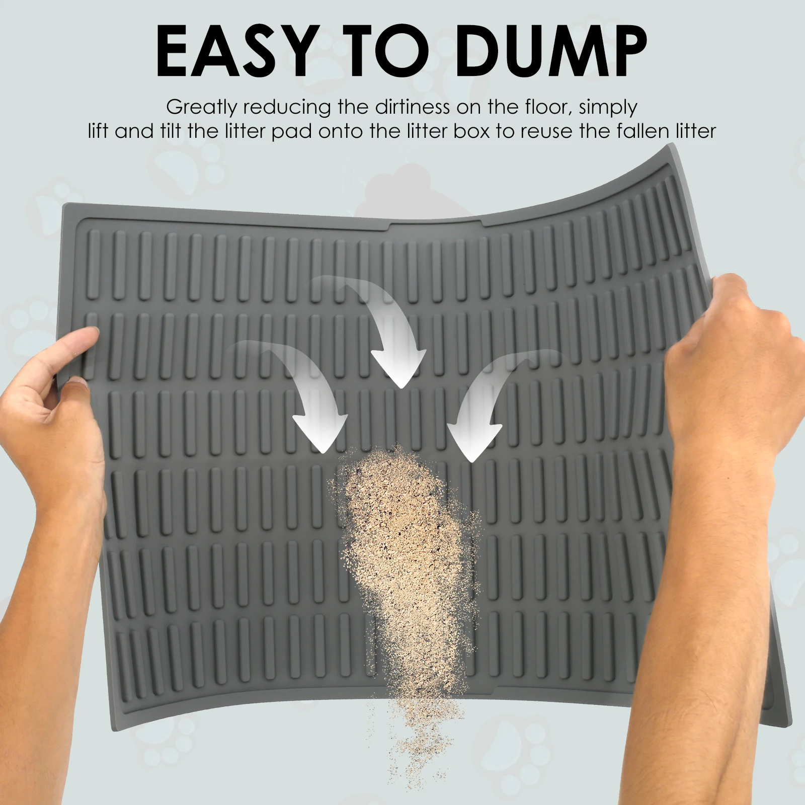 Grooved Cat Litter Catcher Mat: The grooved cat litter catcher mat traps most of the litter and greatly reduces messes on the floor. And after a few days of use, simply lift and tilt the mat over the litter box to reuse the dropped litter